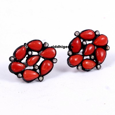 925 Sterling Silver Rose Cut Diamond Italian Coral Gemstone Stud Earring 354A